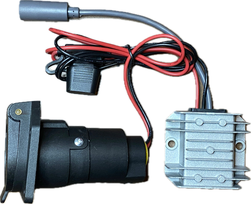 Plug one end into the 7-way trailer cord, and you've got power from the trailer's on-board batteries.